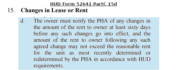 d. The owner must notify the PHA of any changes in the amount of the rent to owner at least sixty days before any such changes go into effect, and the amount of the rent to owner following any such agreed change may not exceed the reasonable rent for the unit as most recently determined or redetermined by the PHA in accordance with HUD requirements.